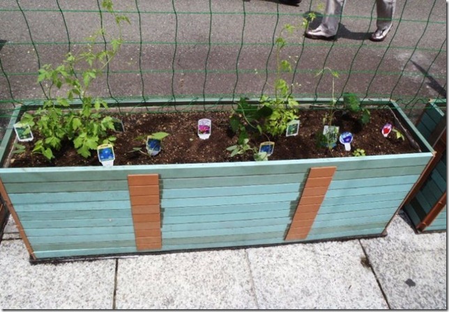 下部に保水装置のついた大型コンテナに植え付けたところです。