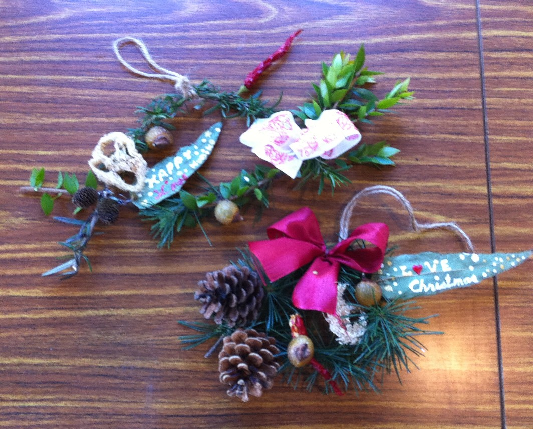 皆さん、オリジナルのクリスマスオーナメントを作っていただきました。