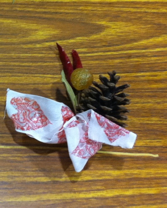 松ぼっくりとムクロジ、トウガラシ、リボンがセットになっています。